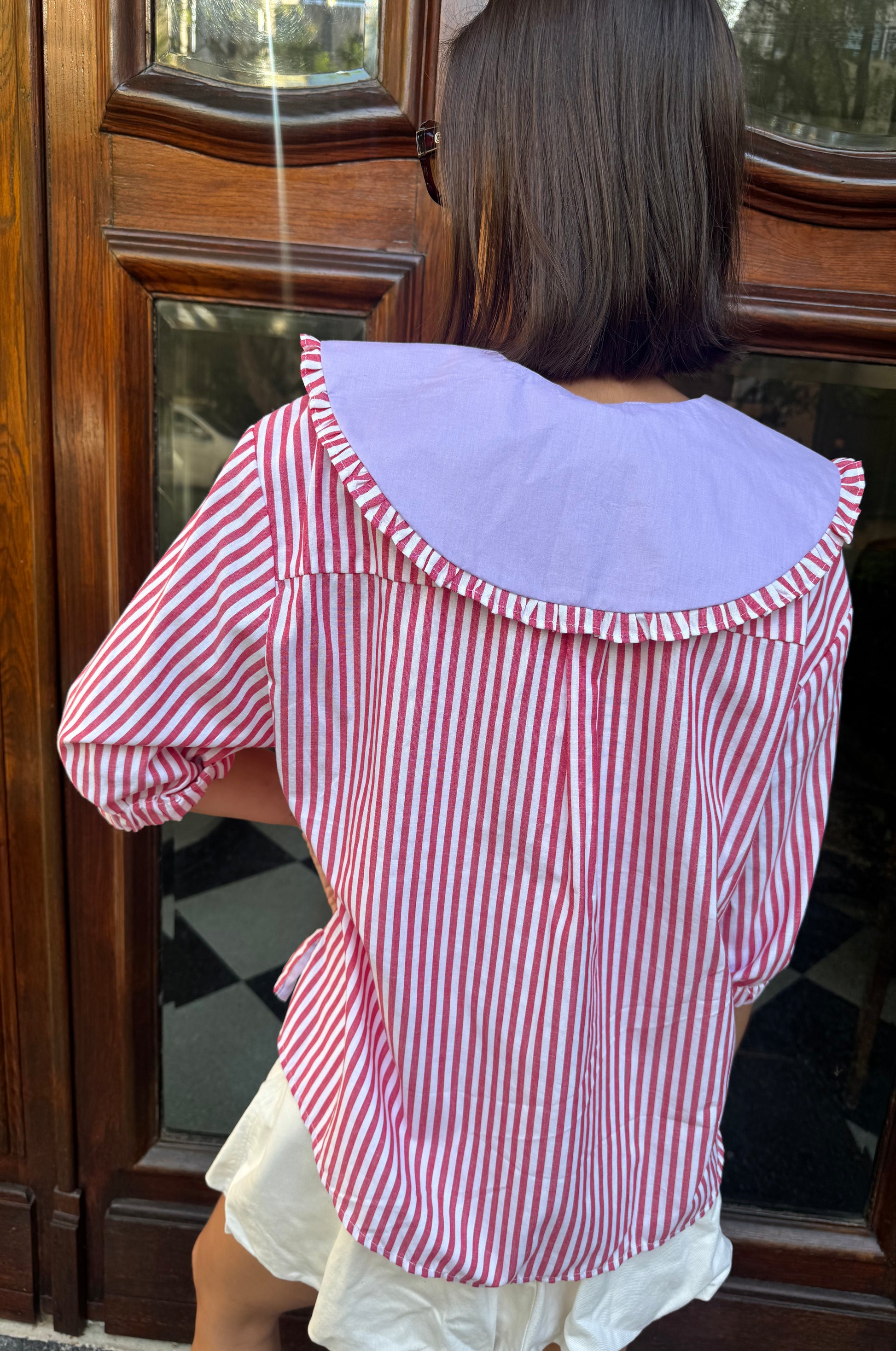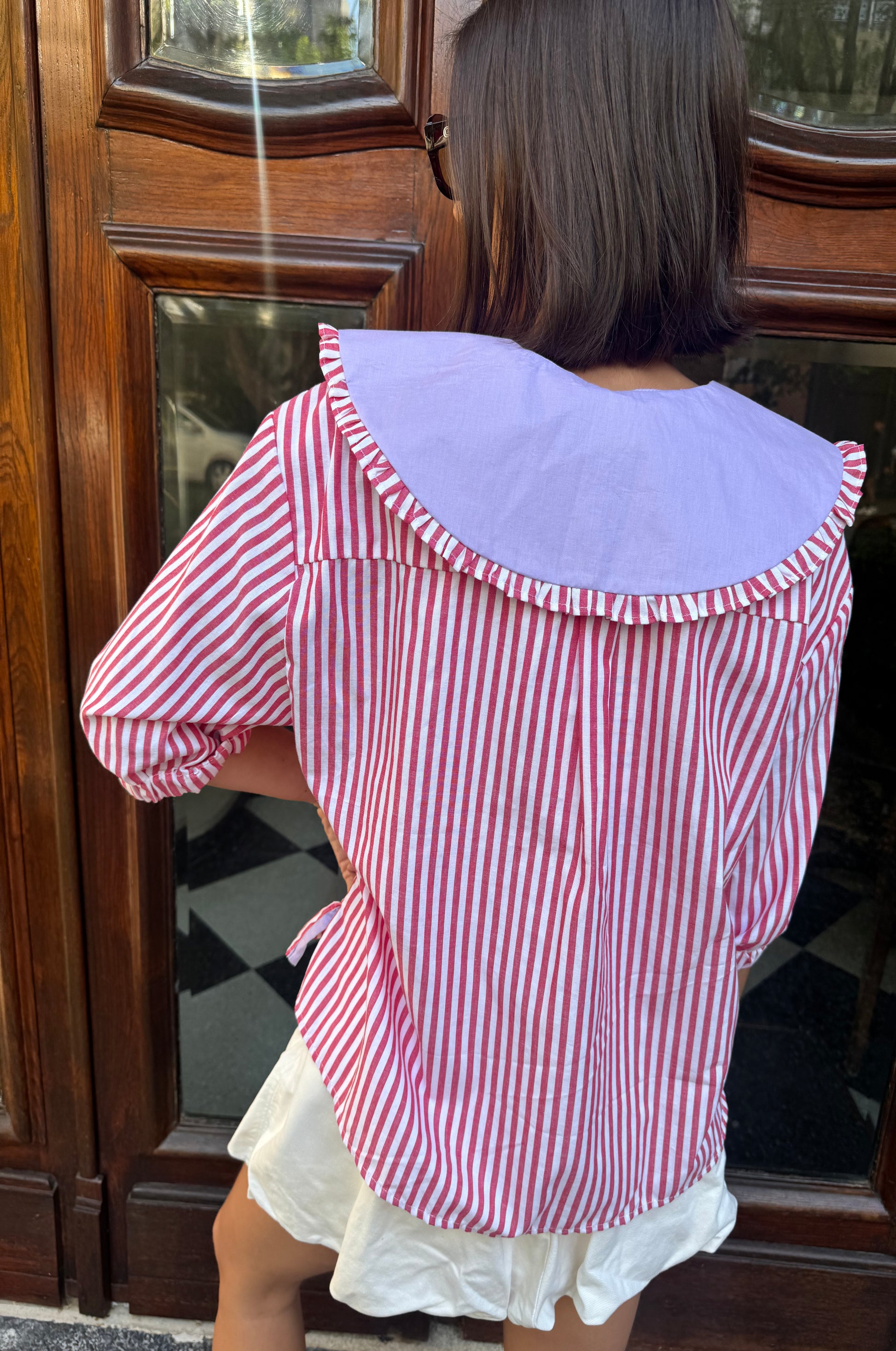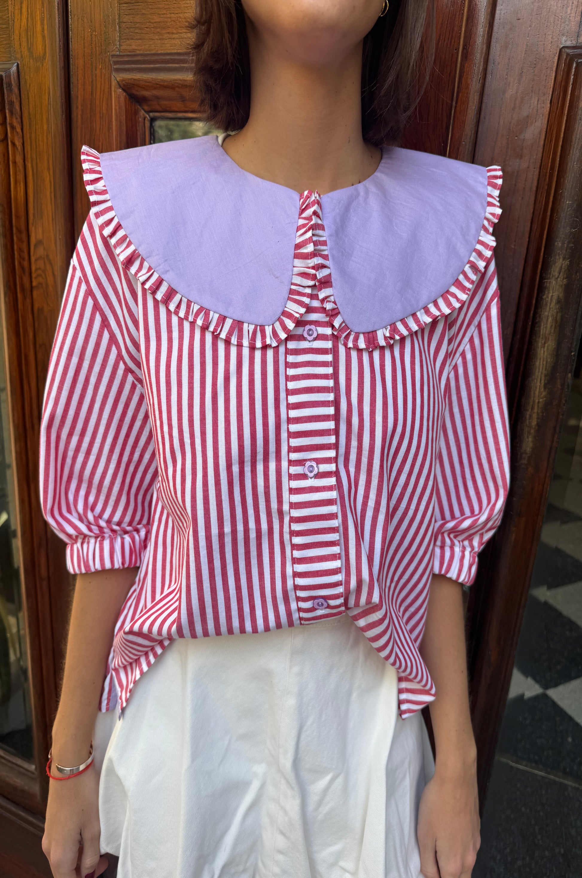 Camisa con mangas abullonadas y cuello de bebé que se puede remover. Ideal para usarlo por arriba de sweaters, o solo la camisa si buscas algo más básico :)