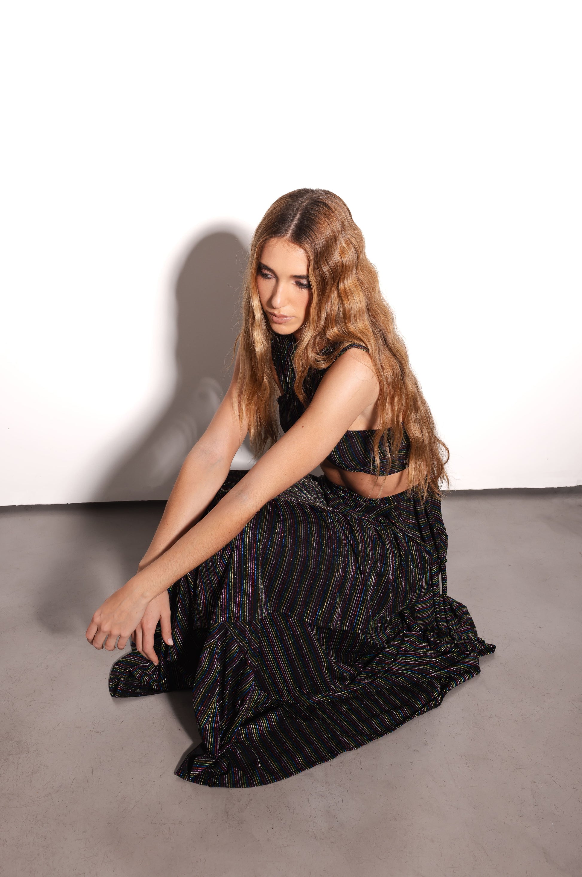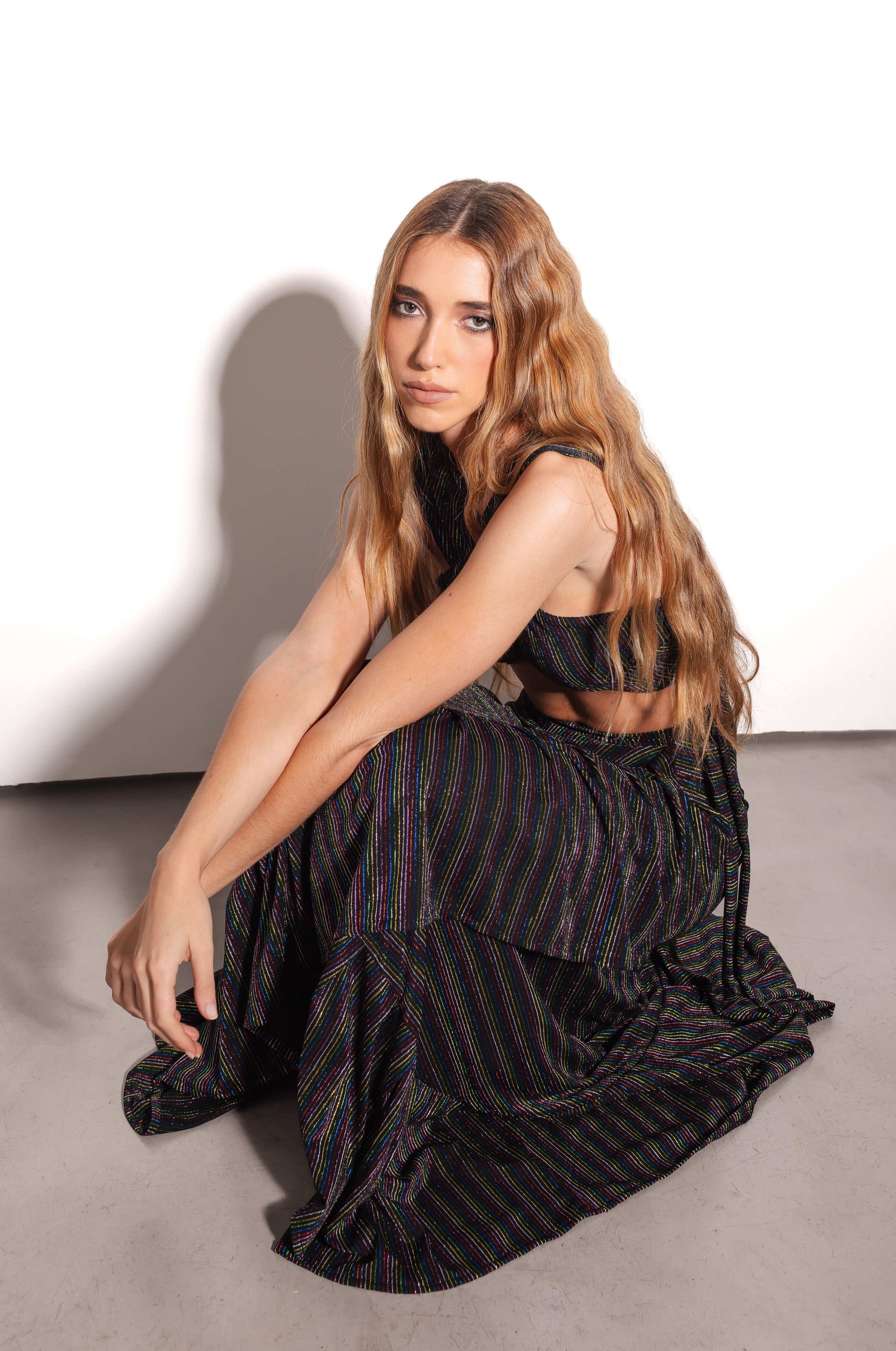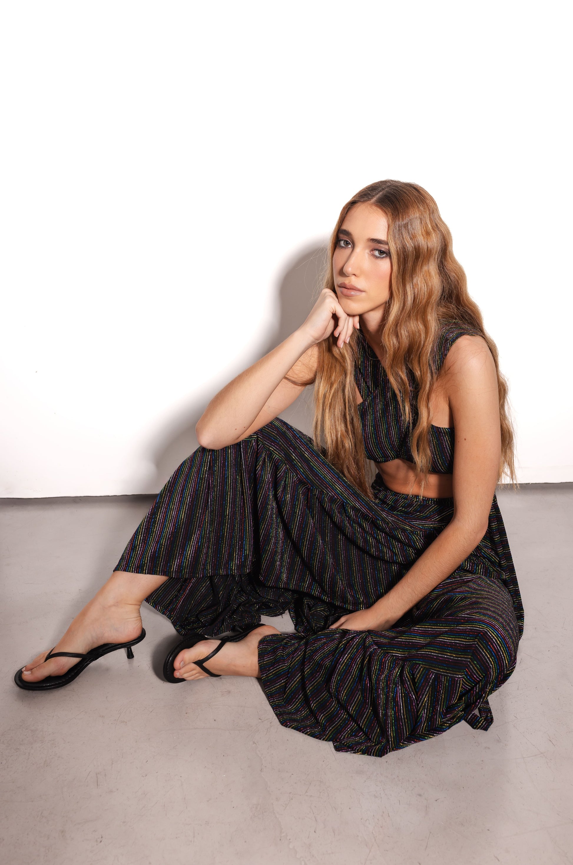 Falda larga confeccionada en tela de punto con sutil brillo, que se adapta cómodamente a distintos talles. De calce al cuerpo y caída fluida, realza la silueta con movimiento natural. Prenda versátil y elegante, ideal para acompañar el top a juego o con una remera de Algodón para el día a día.