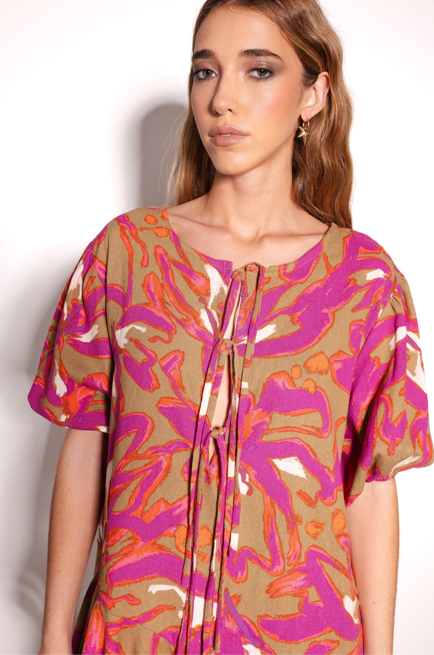 Vestido de calce suelto, confeccionado en tela liviana y fresca. Cuenta con escote con abertura y lazos ajustables al frente, un detalle simple que suma estilo. Las mangas cortas con leve volumen le dan un aire femenino y cómodo. Ideal para usar todos los días, tanto de día como de tarde.