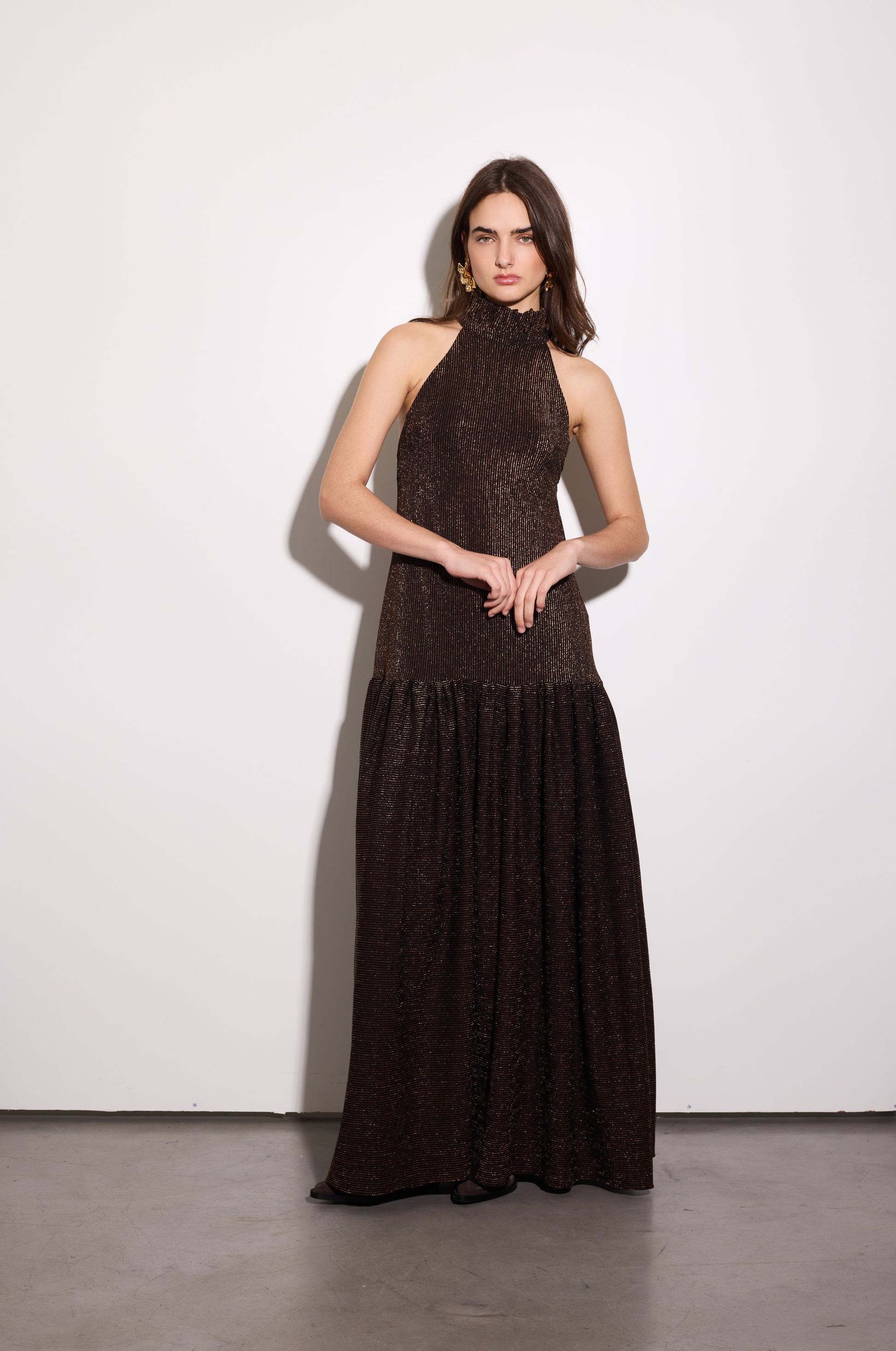 Vestido largo holgado con escote halter y espalda baja. Detalles con volado en el cuello y maxi volado en la cadera.