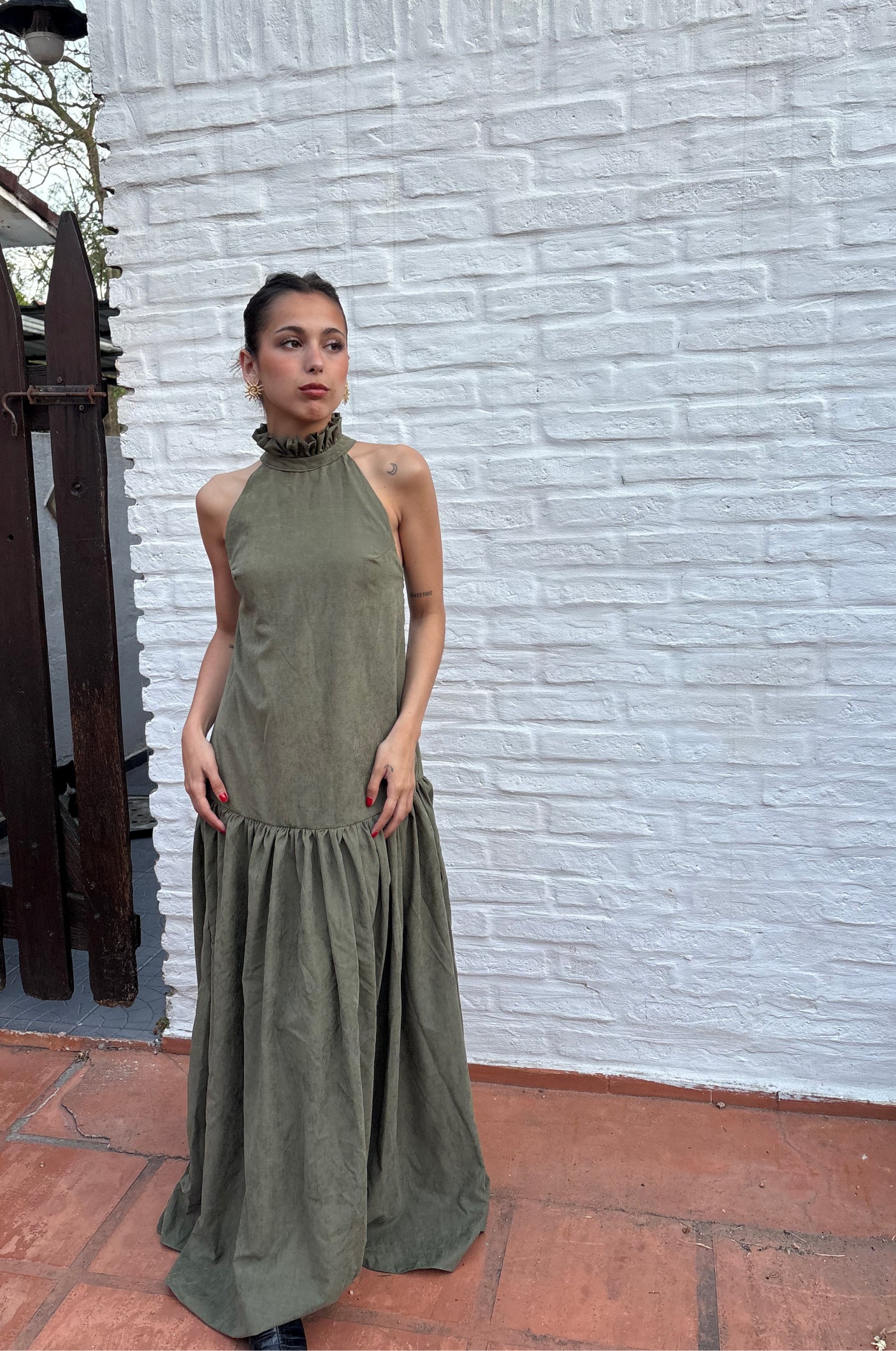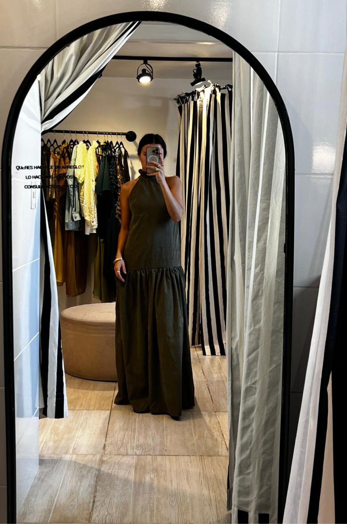 Vestido largo holgado con escote halter y espalda baja. Detalles con volado en el cuello y maxi volado en la cadera.